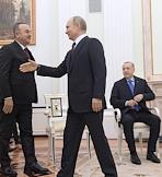 Переговоры президента России Владимира Путина с президентом Турецкой Республики Реджепом Тайипом Эрдоганом. Слева направо: министр иностранных дел Турции Мевлюта Чавушоглу, президент России Владимир Путин и президент Турции Реджеп Тайип Эрдоган во время переговоров.
