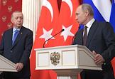 Переговоры президента России Владимира Путина с президентом Турции Реджепом Тайипом Эрдоганом в Кремле. Президент Турции Реджеп Тайип Эрдоган (слева) и президент России Владимир Путин (справа) во время пресс-конференции по итогам переговоров.