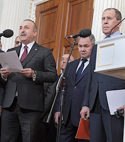 Переговоры президента России Владимира Путина с президентом Турции Реджепом Тайипом Эрдоганом. Слева направо: министр иностранных дел Турции Мевлют Чавушоглу, министр обороны России Сергей Шойгу и министр иностранных дел России Сергей Лавров во время пресс-конференции по итогам переговоров.