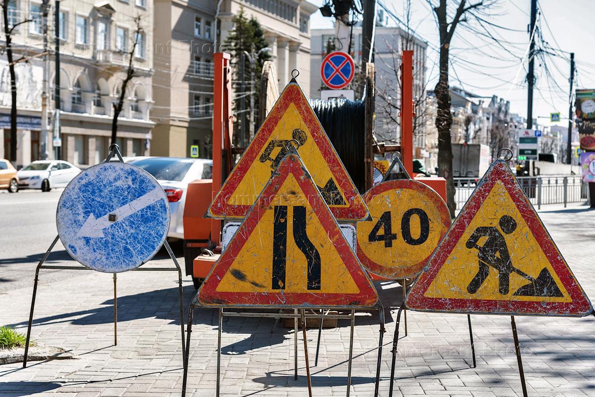 Жанровая фотография. Дорожные знаки перед участком дороги, в пределах которого проводятся ремонтные работы.