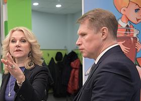 Рабочая поездка президента России Владимира Путина в Ивановскую область. Заместитель председателя правительства России Татьяна Голикова (слева) и министр здравоохранения России Михаил Мурашко (справа) во время посещения городской клинической больницы №4.