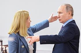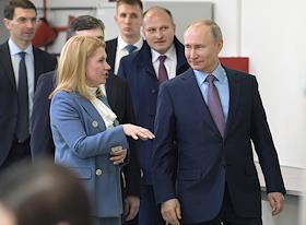 Рабочая поездка президента России Владимира Путина во Ивановскую область. Президент России Владимир Путин (справа) и генеральный директор Ивановского парашютного завода "Полет" Юлия Портнова (слева) во время посещения Ивановского парашютного завода "Полет".