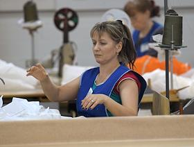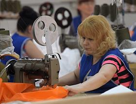 Рабочая поездка президента России Владимира Путина во Ивановскую область. Швея Ивановского парашютного завода "Полет" во время работы.