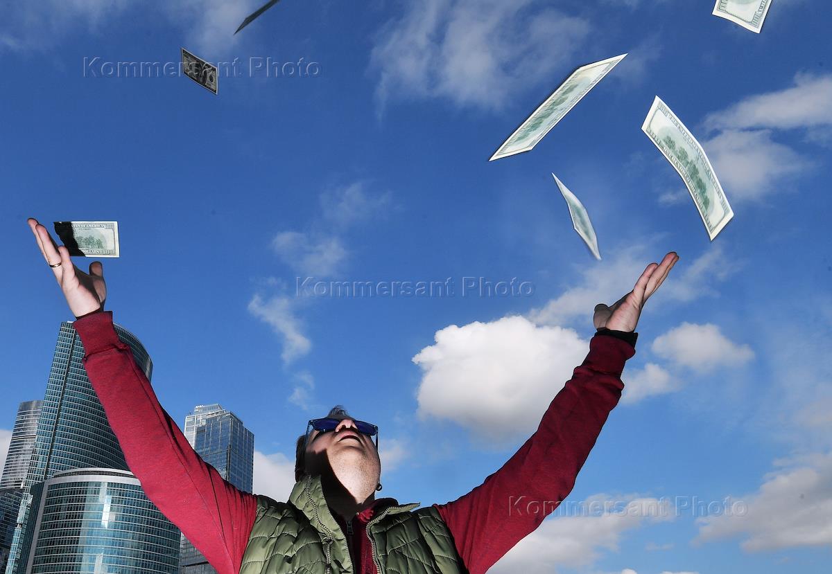 Жанровая фотография. Мужчина подбрасывает доллары на фоне Московского международного делового центра (ММДЦ) "Москва-сити".