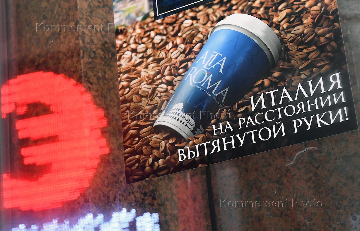 Жанровая фотография. Эмблема евро в пункте обмена валют и рекламный плакат кофе Alta Roma "Италия на расстоянии вытянутой руки!".