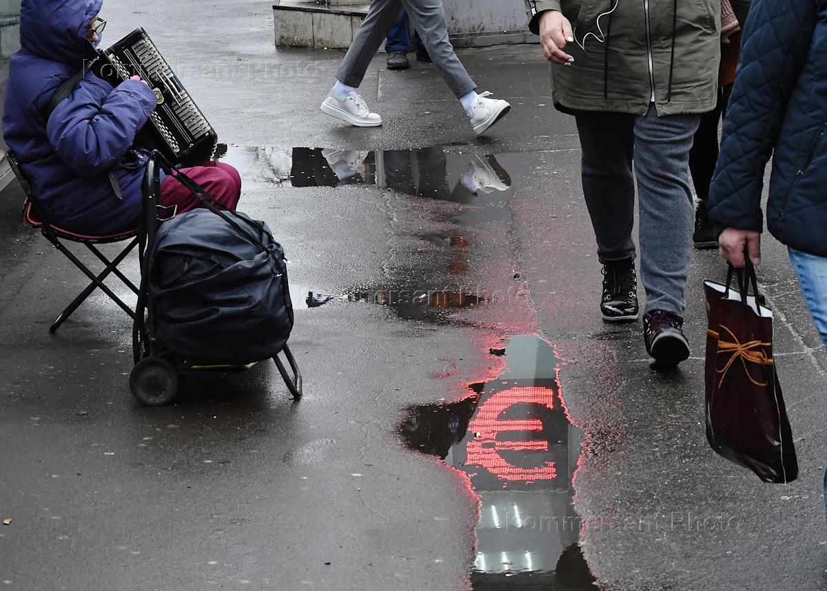 Genre photography. Euro sign on the scoreboard of a currency exchange office reflected in a puddle.