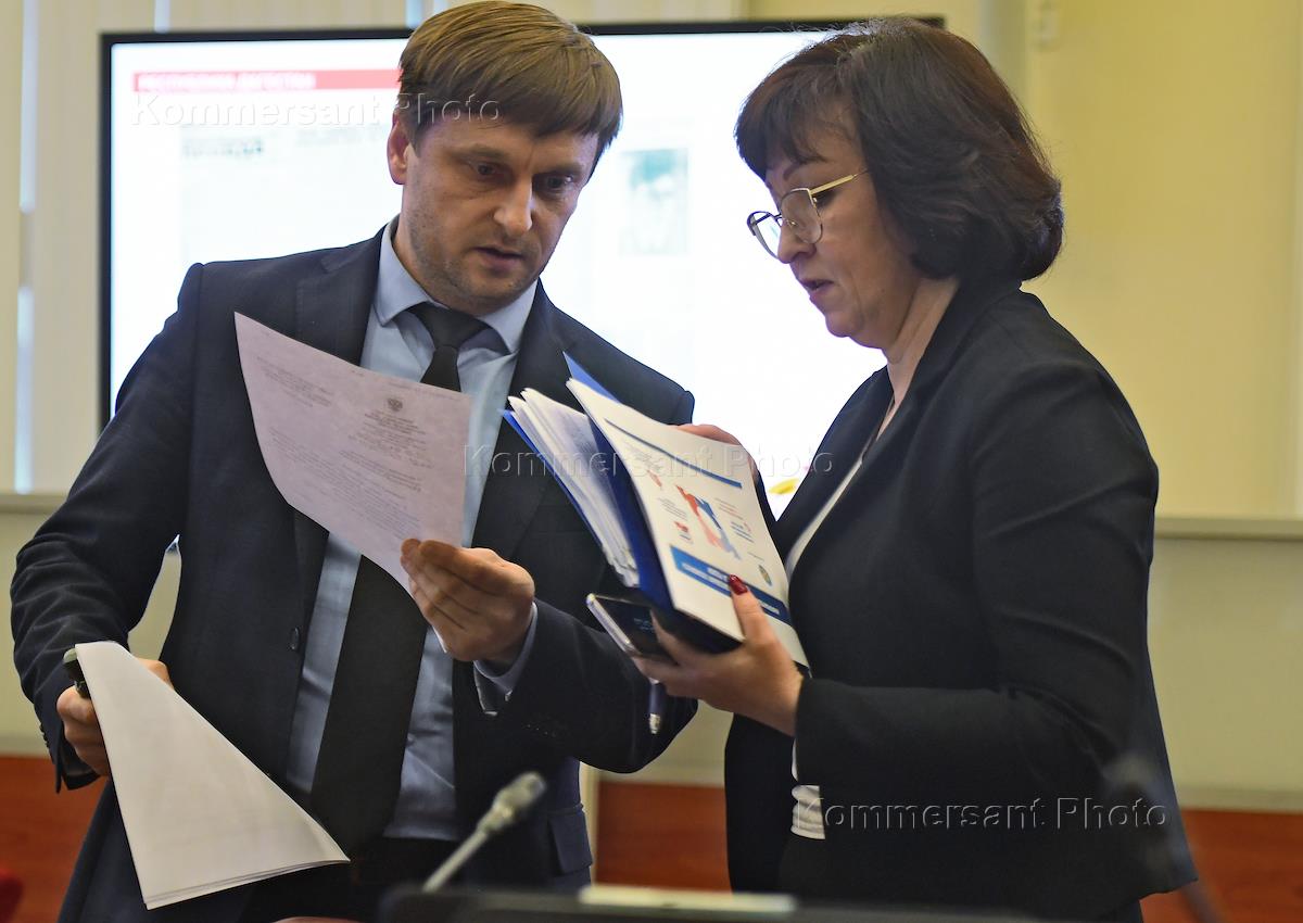 Заседание Центральной избирательной комиссии (ЦИК) России. Председатель ЦИК России Элла Памфилова (справа) и заместитель председателя ЦИК России Николай Булаев (слева) во время заседания.