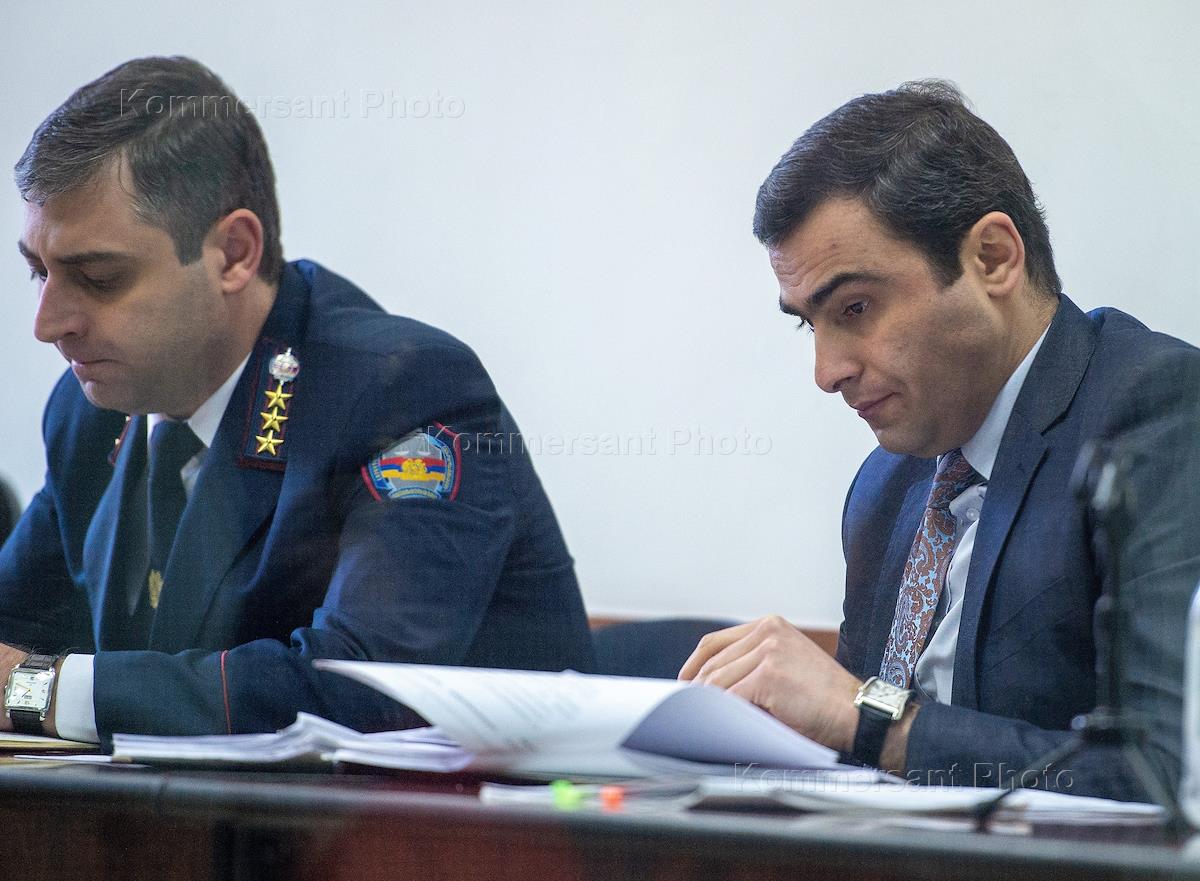 Бывший президент Армении Роберт Кочарян (слева), обвиняемый в свержении конституционного строя в рамках уголовного дела о разгоне акций протеста 1 марта 2008 года, во время заседания Суда общей юрисдикции Ереване.