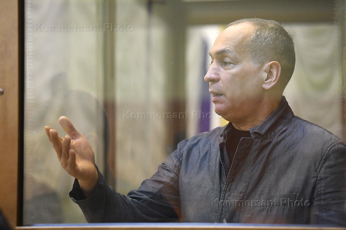 Бывший глава Серпуховского района Александр Шестун (в центре), обвиняемый в мошенничестве и взяточничестве, во время заседания Подольского городского суда Московской области.