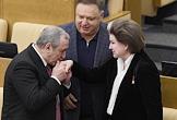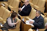 Пленарное заседание Государственной думы России. Член комитета ГД России по энергетике Александр Карелин (в центре) и член комитета ГД России по физической культуре, спорту, туризму и делам молодежи Рима Баталова (справа) перед началом заседания.