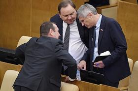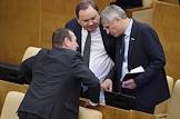Пленарное заседание Государственной думы (ГД) России. Справа налево: заместитель председателя комитета ГД России по аграрным вопросам Алексей Лавриненко, член комитета ГД России по транспорту и строительству Виктор Дерябкин и член комитета ГД России по энергетике Геннадий Скляр перед началом заседания.