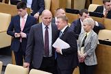 Пленарное заседание Государственной думы (ГД) России. Первый заместитель председателя комитета ГД России по конституционному законодательству и государственному строительству Вячеслав Лысаков (слева) и член комитета ГД России по контролю и Регламенту Виктор Дзюба (справа) перед началом заседания.