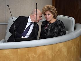 Пленарное заседание Государственной думы (ГД) России. Министр финансов России Антон Силуанов (слева) и первый заместитель министра финансов России Татьяна Нестеренко (справа) во время заседания.