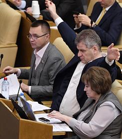 Пленарное заседание Государственной думы (ГД) России. Слева направо: член комитета по безопасности и противодействия коррупции Азимов Рахим, член комитета ГД России по государственному строительству и законодательству Евгений Марченко и член комитета ГД России по образованию и науке Алена Аршинова во время заседания.