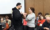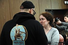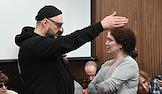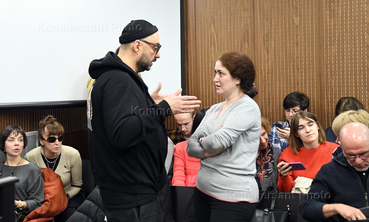 Рассмотрение дела "Седьмой студии" в Мещанском районном суде. Художественный руководитель "Гоголь-центра" Кирилл Серебренников (слева) и директор Российского Академического Молодежного театра (РАМТ) Софья Апфельбаум (в центре) перед началом заседания суда.