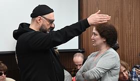 Рассмотрение дела "Седьмой студии" в Мещанском районном суде. Художественный руководитель "Гоголь-центра" Кирилл Серебренников (слева) и директор Российского Академического Молодежного театра (РАМТ) Софья Апфельбаум (справа) перед началом заседания суда.
