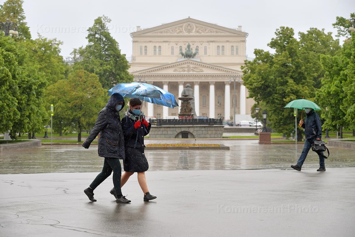 Moscow during self-isolation regime caused by the danger of the coronavirus COVID-19 spread. Genre photo. Passers-by with umbrellas wearing face masks walk past Bolshoi State Academic Theater.