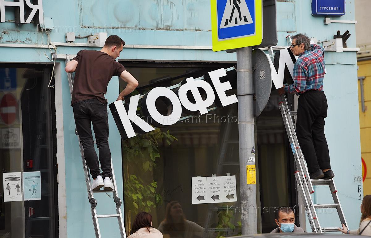 Moscow during self-isolation regime caused by the danger of the coronavirus COVID-19 spread. Genre photo. Workers hang Coffee Bean sign on the building.