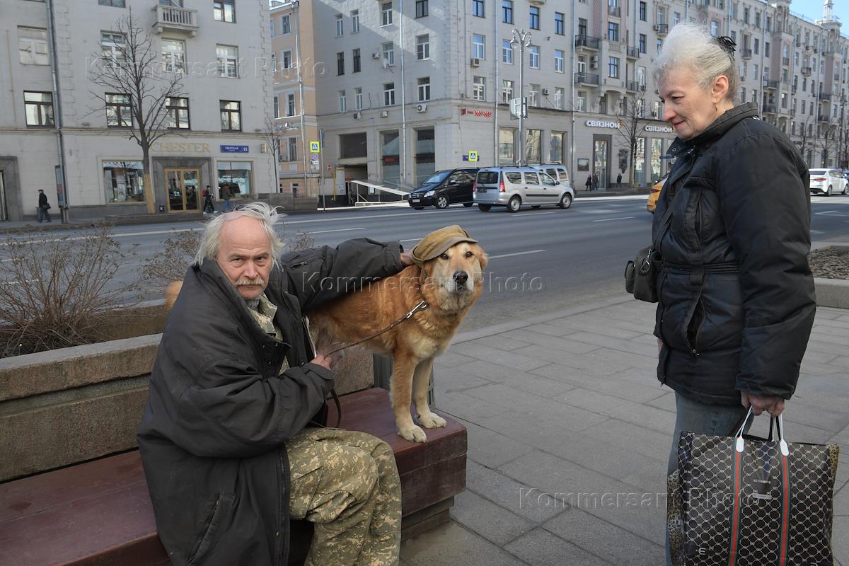 Москва во время режима самоизоляции из-за опасности распространения коронавирусной инфекции COVID-19. Жанровая фотография. Арбат. Мужчина с табличкой "Помогите пожалуйста найти работу.