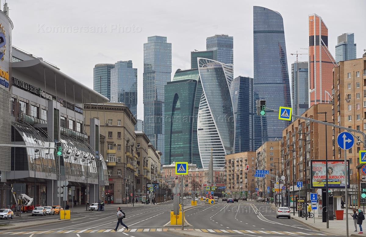 Moscow during self-isolation regime caused by the danger of the coronavirus COVID-19 spread. Genre photo. Business Center on Arbat.
