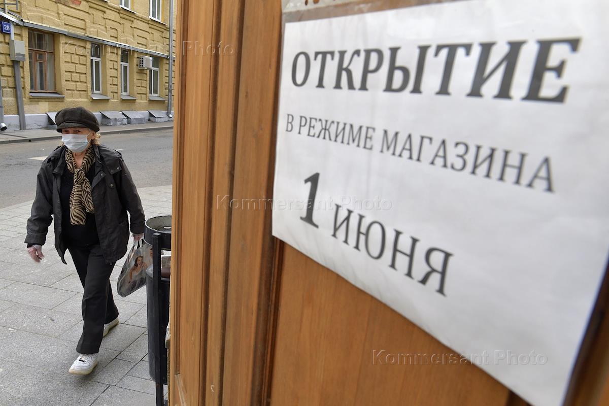 Режим самоизоляции из-за опасности распространения коронавирусной инфекции COVID-19. Жанровая фотография. Женщина в медицинской маске проходит мимо объявления "Открытие в режиме магазина 1 июня".