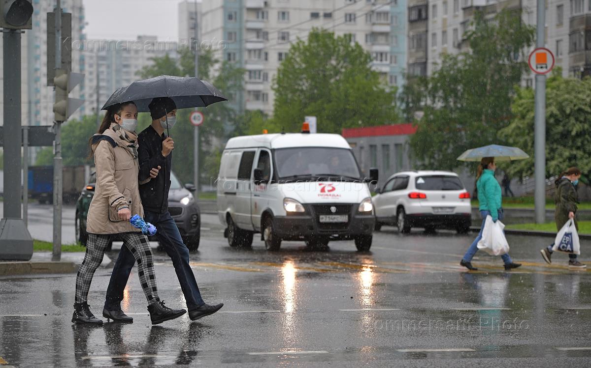 Moscow during self-isolation regime caused by the danger of the coronavirus COVID-19 spread. Genre photo. Young man and woman under an umbrella cross the street on the pedestrian crosswalk in front of the ambulance.