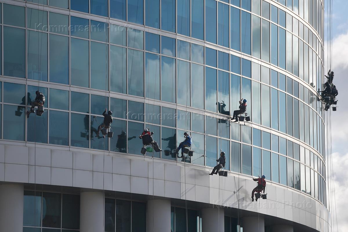 Жанровая фотография. Промышленные альпинисты во время мытья окон многоэтажного офисного здания.