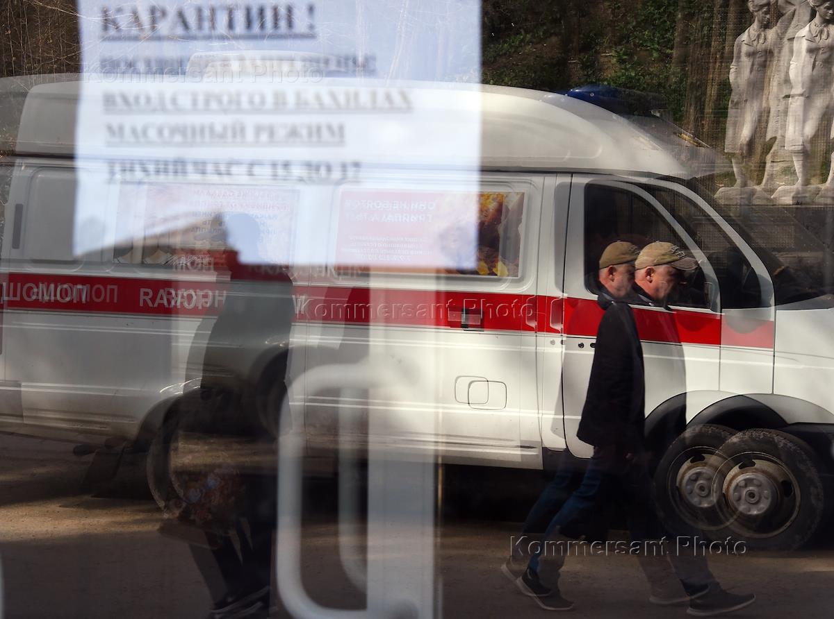 Genre photo on coronavirus. Ambulance on the street in Yalta.