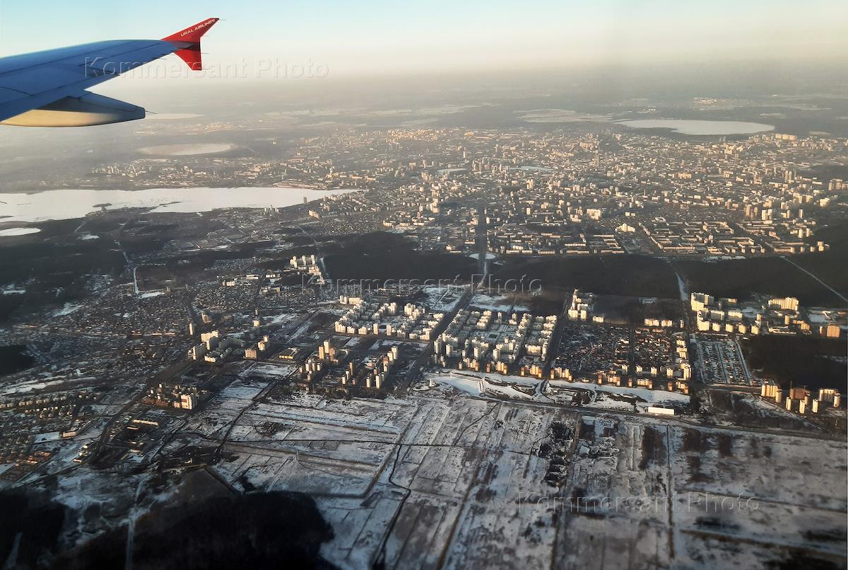 Виды Екатеринбурга. Жанровая фотография. Вид на город из иллюминатора самолета.
