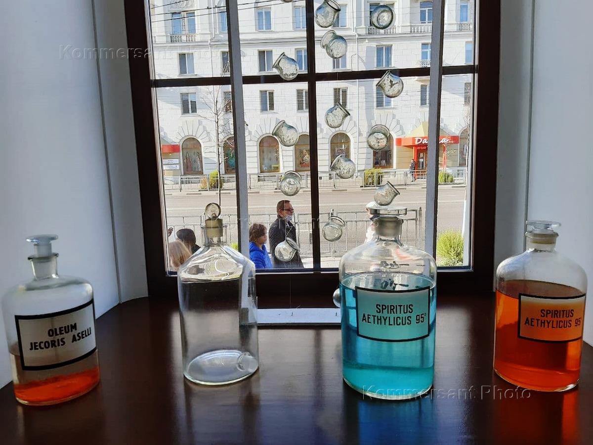 Genre photography. Glass laboratory bottles with liquid of different colors.