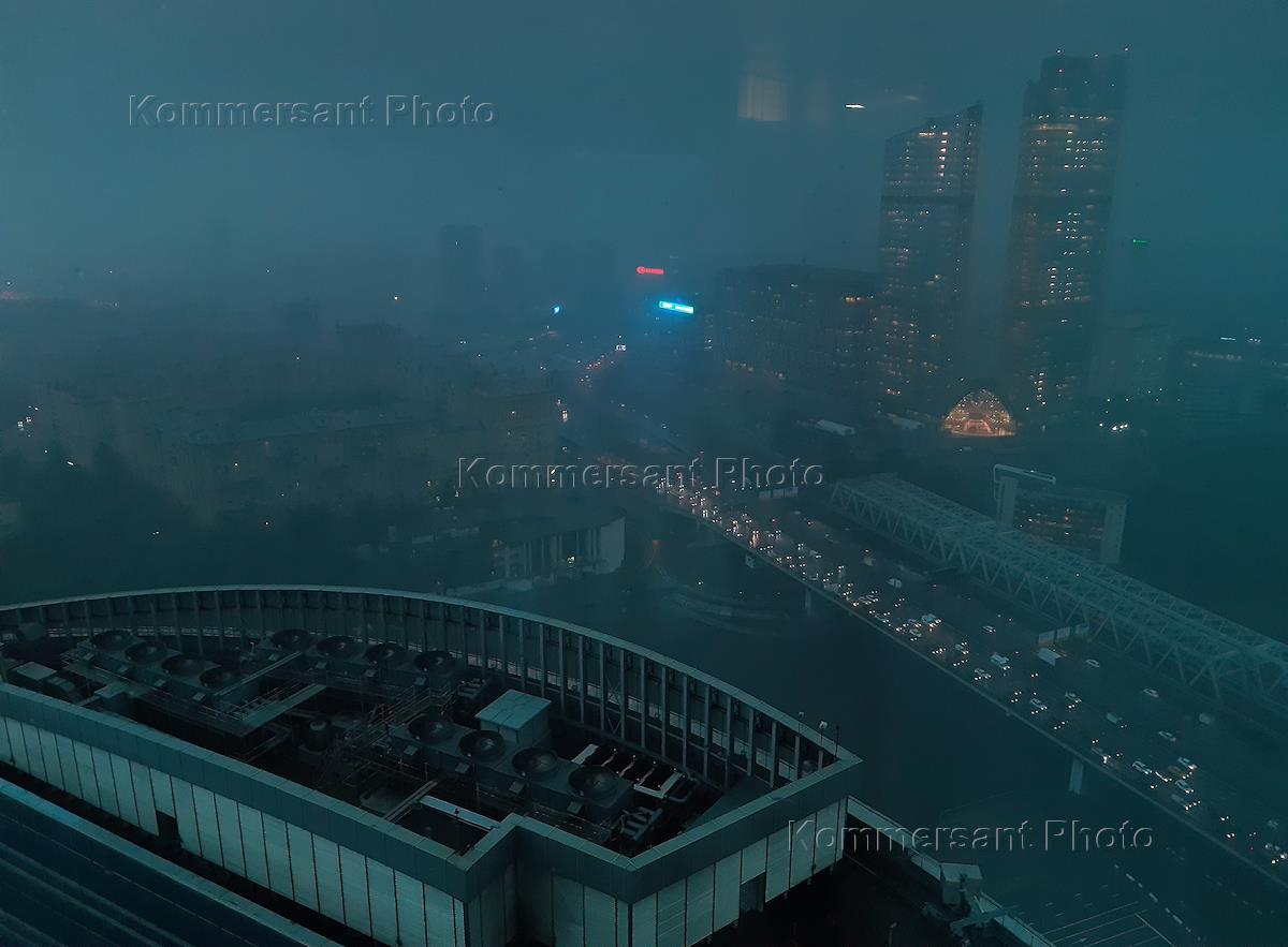 Genre photography. Downpour in the city. View of the Third Transport Ring from the window of the Naberezhnaya Tower building of the Moscow City International Business Center.