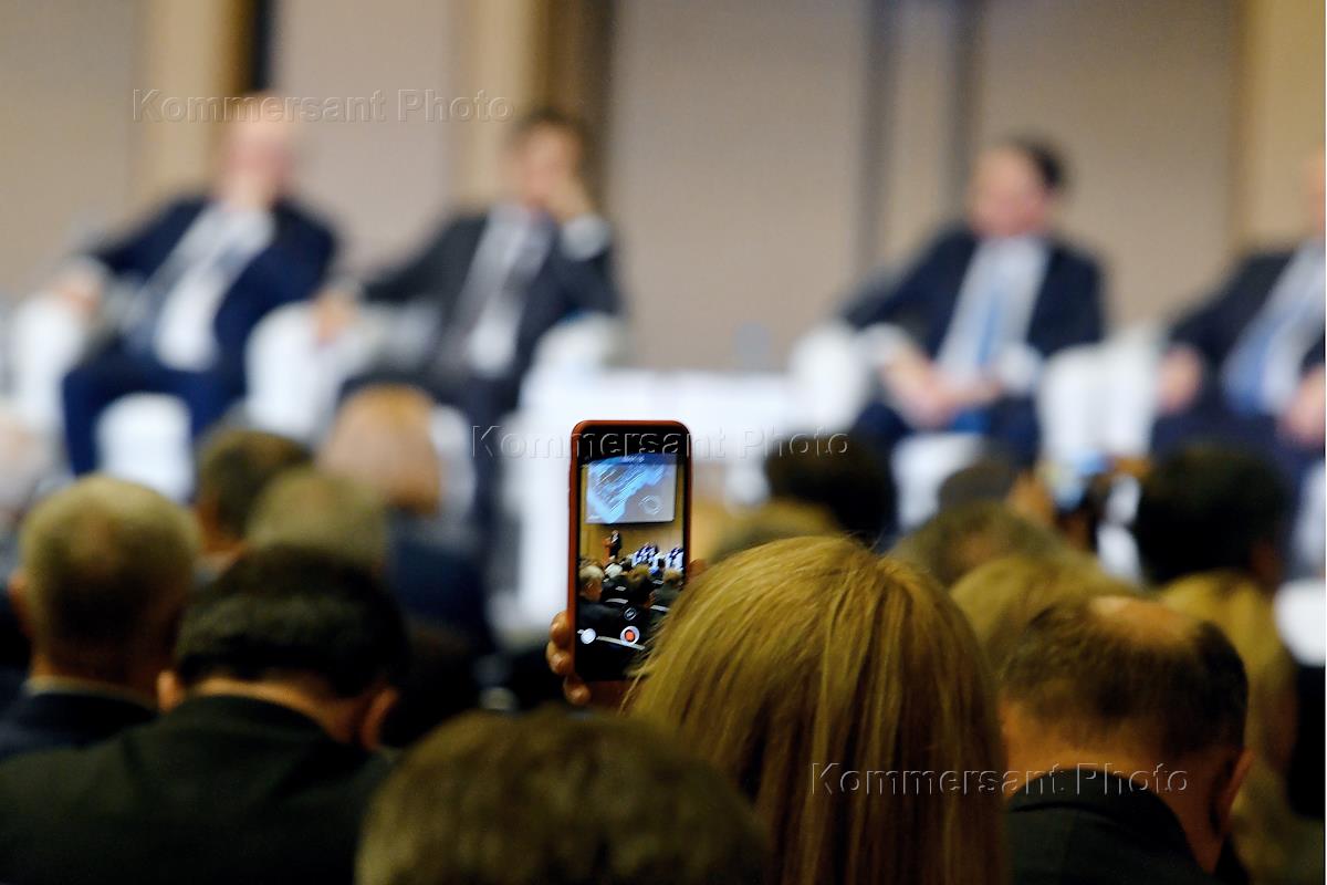 Международный экономический форум государств-участников СНГ прошел в Центре международной торговли (ЦМТ). Генеральный директор "ВТБ капитал" Алексей Яковицкий (слева) и председатель Коллегии Евразийской экономической комиссии Михаил Мясникович (второй справа) во время работы форума.