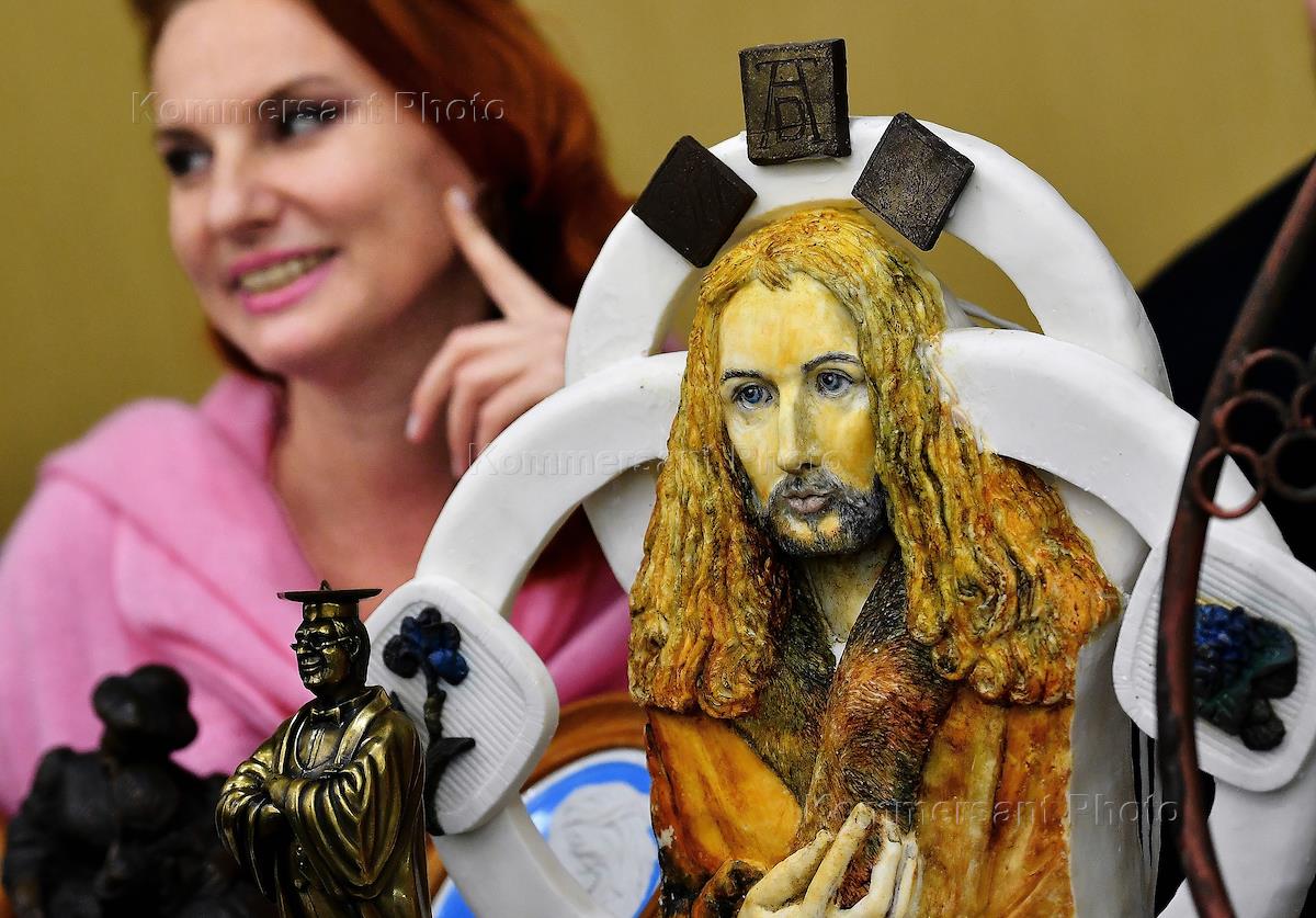Международный экономический форум государств-участников СНГ прошел в Центре международной торговли (ЦМТ). Скульптура Христа на сувенирном прилавке.