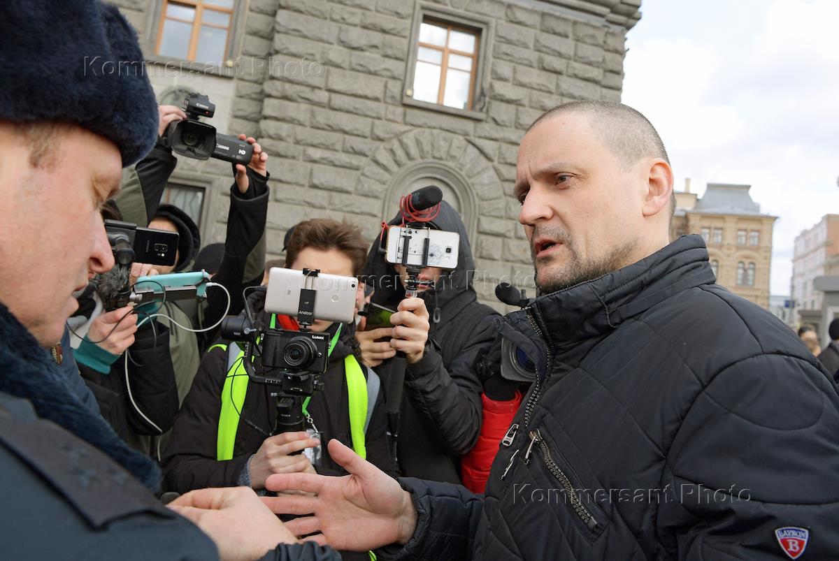 Лидер движения "Левый фронт" Сергей Удальцов (справа) во время одиночных пикетов "Обнулите сроки политзекам" на Лубянской площади.