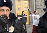Серия одиночных пикетов "Обнулите сроки политзекам" на Лубянской площади. Участники и сотрудники полиции во время акции.