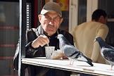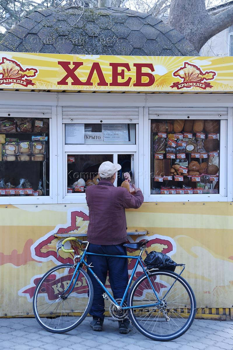Жанровая фотография. Покупатель у окошка уличной палатки с хлебными изделиями.