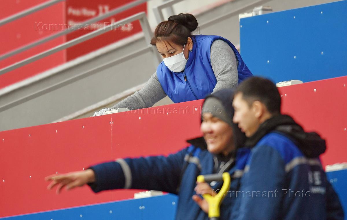 Жанровая фотография. Уборщица в медицинской маске во время дезинфекционной обработки зрительских трибун на стадионе "ВЭБ Арена".