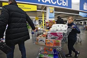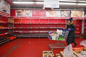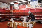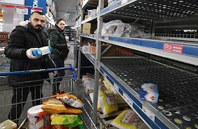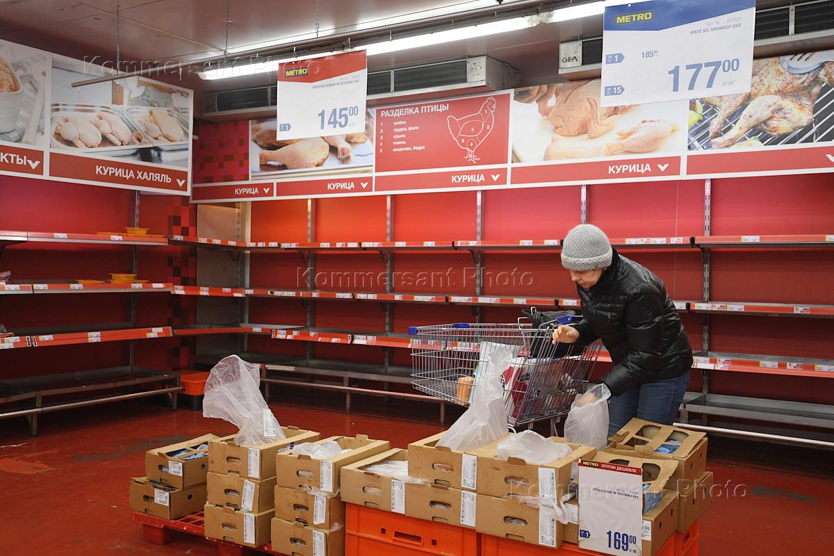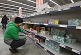Жанровая фотография. Покупатели у пустых полок гипермаркета Metro Cash&Carry (МЕТРО кеш энд кэрри).