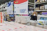 Гипермаркет МЕТРО. Покупательница в медицинской маске у прилавка с туалетной бумагой.