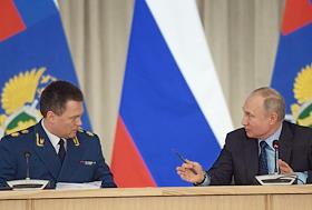 Расширенное заседание коллегии Генеральной прокуратуры России. Генеральный прокурор России Игорь Краснов (слева) и президент России Владимир Путин (справа) во время заседания.