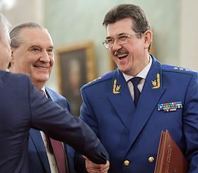 Расширенное заседание коллегии Генеральной прокуратуры России. Министр России по делам гражданской обороны, чрезвычайным ситуациям и ликвидации последствий стихийных бедствий Евгений Зиничев (справа), полномочный представитель президента России в Уральском федеральном округе (УрФО) Николай Цуканов (второй справа) и полномочный представитель президента России в Сибирском федеральном округе Сергей Меняйло (слева) перед началом заседания.