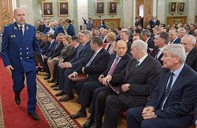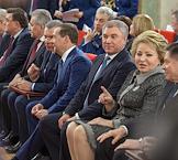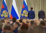 Расширенное заседание коллегии Генеральной прокуратуры России. Справа налево: председатель Верховного суда России Вячеслав Лебедев, председатель Совета Федерации России Валентина Матвиенко, председатель Государственной думы России Вячеслав Володин, заместитель председателя Совета Безопасности России Дмитрий Медведев, заместитель председателя правительства России Юрий Борисов, министр обороны России Сергей Шойгу и министр юстиции России Константин Чуйченко во время заседания.