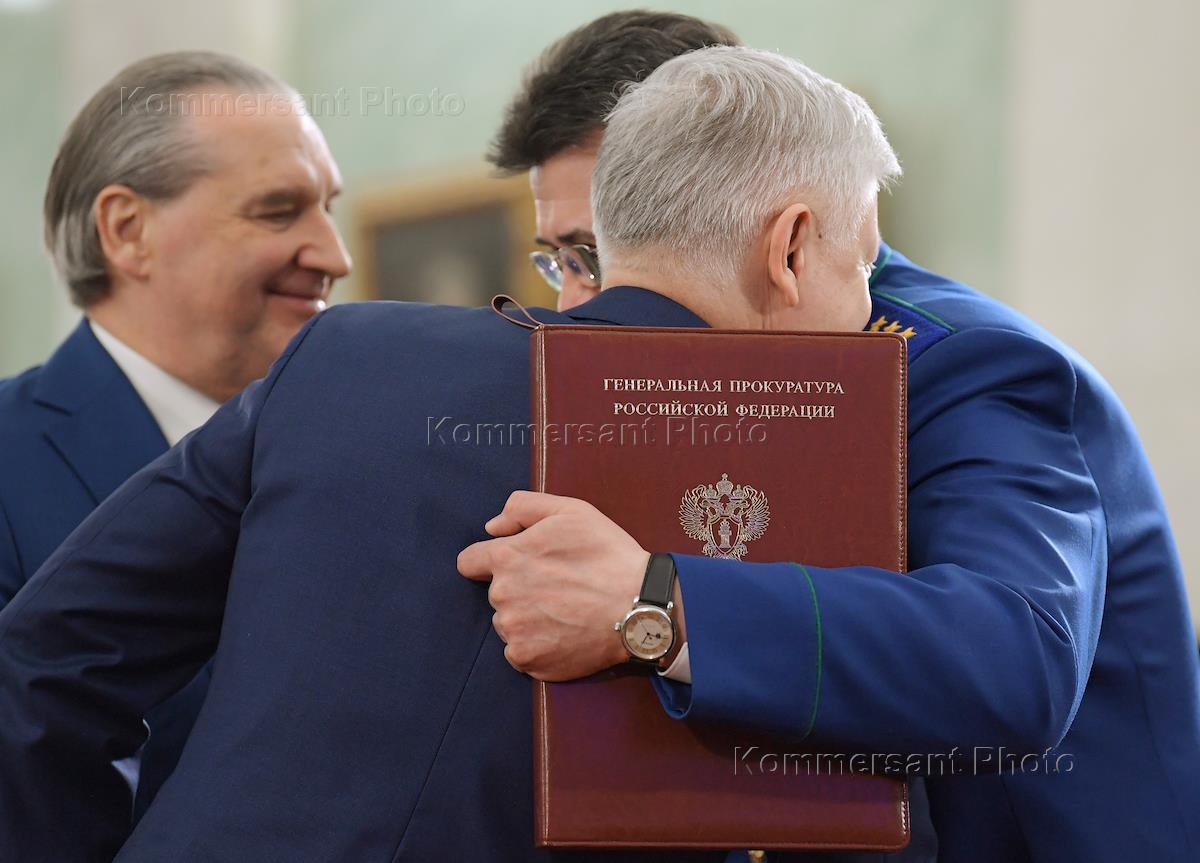 Расширенное заседание коллегии Генеральной прокуратуры России. Генеральный прокурор России Игорь Краснов (слева) и президент России Владимир Путин (в центре) во время заседания.