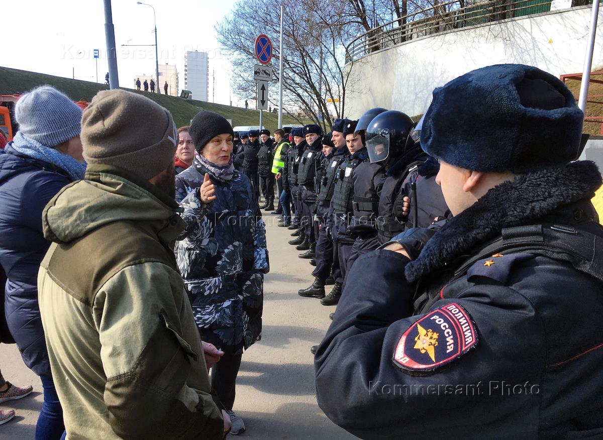Сотрудники полиции и участники акция протеста у Московского завода полиметаллов против начала строительства Юго-Восточной хорды.
