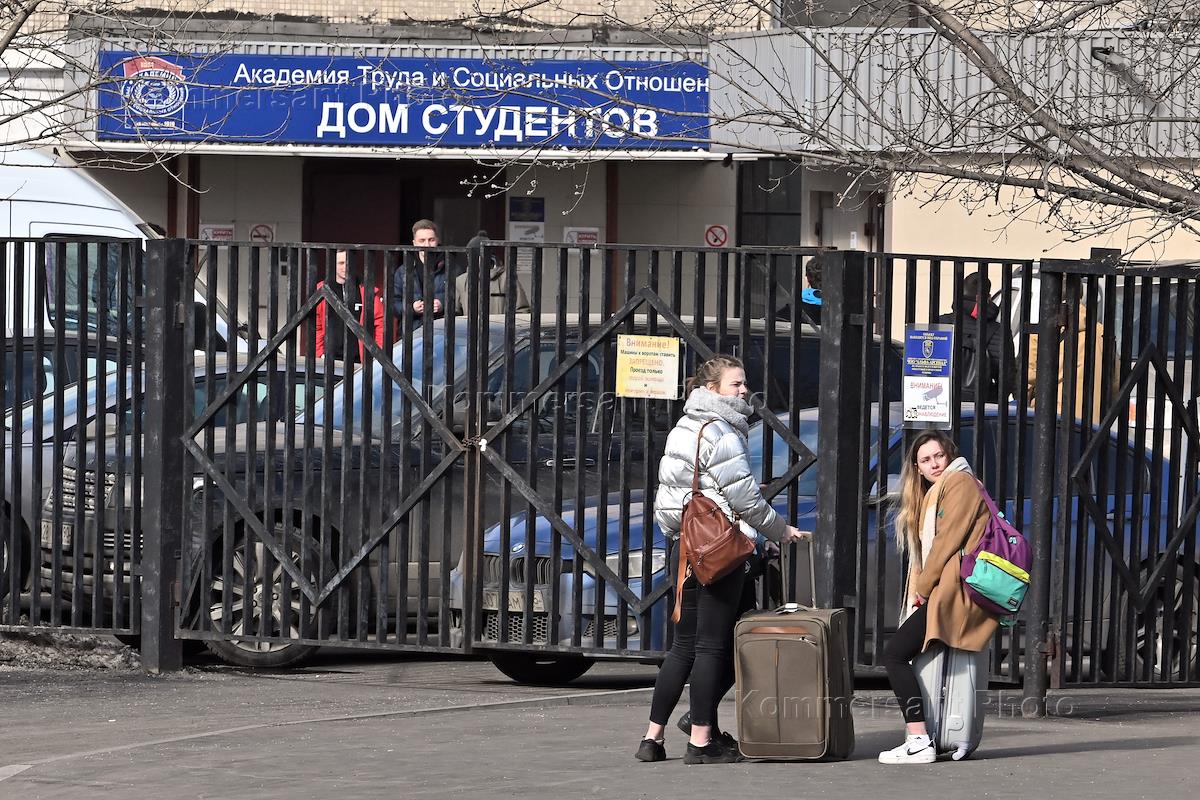 Ситуация у общежития №2 МГИМО по адресу проспект Вернадского, 76 в связи с распоряжением руководства МГИМО о вынужденном выселении иногородних студентов из-за неблагоприятной эпидемиологической ситуацией в Москве.