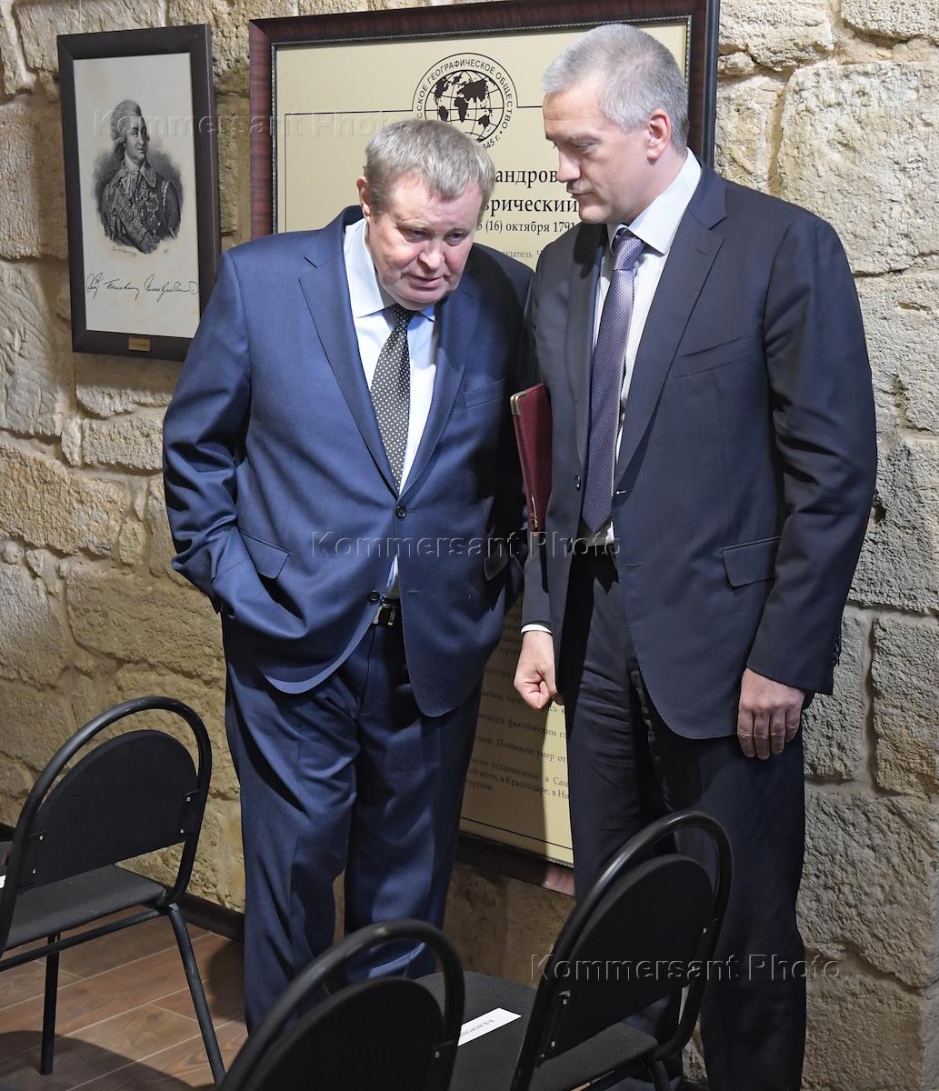 Рабочая поездка президента России Владимира Путина в Крым. Церемония вручения государственных наград в музейно-выставочном комплексе "Константиновская батарея". Полномочный представитель президента России в Южном Федеральном округе Владимир Устинов (справа) и глава Республики Крым Сергей Аксенов (слева) во время церемонии.