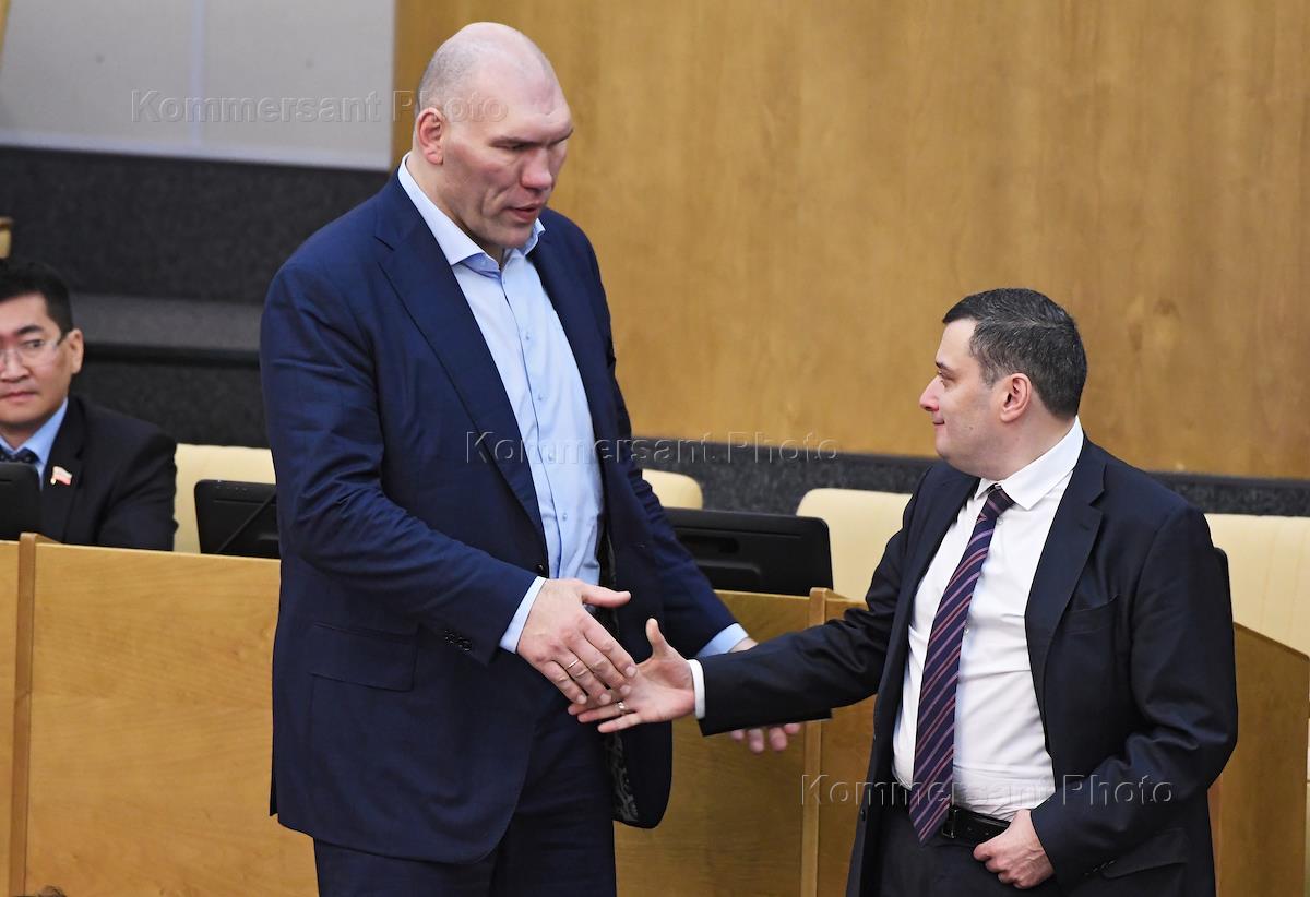 Пленарное заседание Государственной думы (ГД) России. Первый заместитель председателя комитета ГД России по экологии и охране окружающей среды Николай Валуев (в центре) и председатель комитета ГД России по информационной политике, информационным технологиям и связи Александр Хинштейн (справа) перед началом заседания.