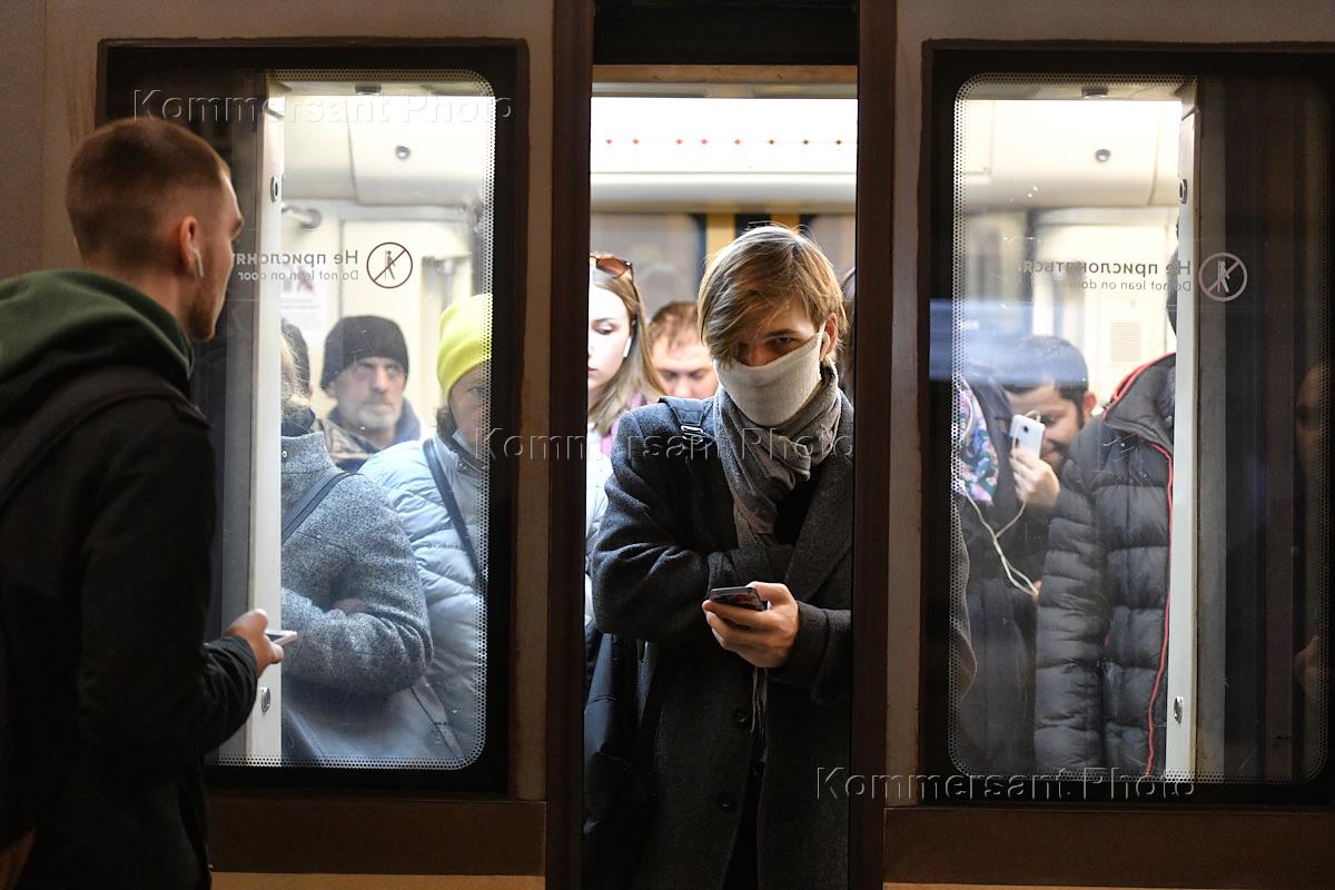 Меры предосторожности против коронавируса COVID-19. Жанровая фотография. Люди в медицинских масках в Московском метро.