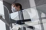 Меры предосторожности против коронавируса COVID-19. Жанровая фотография. Мужчина в защитной маске в окне.