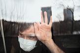 Жанровая фотография. Мужчина прислонился к окну в маске во время самоизоляции.